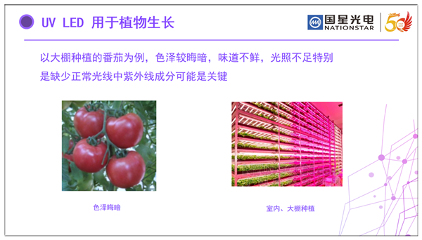 此外,UV LED也可用于植物生长。近年来,室内、大棚种植蓬勃发展,解决了寒冷地区冬季缺乏新鲜蔬菜的问题,但部分上市的室内、大棚蔬菜水果存在色泽偏暗、味道不鲜等品质问题。究其原因是多方面的,但由于光照不足特别是缺少正常光线中紫外线成分也许是关键因素。研究发现,在大棚等室内种植补充一定剂量的UV照射,可影响植物生长、生理活动,进而起到改善植物品质的作用。