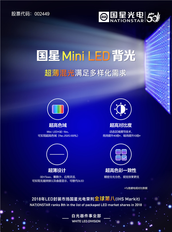 Mini SMD器件拥有独创的杯型和出光角度设计,可实现高可靠性、高亮度和大发光角度等独特优势,可匹配不同客户对OD和pitch的设计要求。其在TV应用上已实现量产,产品性能成熟稳定,是目前最为经济可行的Mini背光大尺寸解决方案。